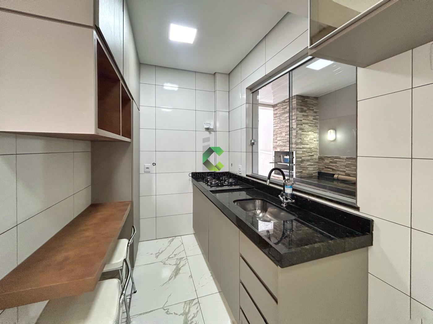 São três quartos bem distribuídos, sendo uma suíte com armários planejados e ar-condicionado, além de um segundo quarto também com armário planejado. Todos os dormitórios possuem piso laminado e acabamento em gesso no teto. A sala é ampla e aconchegante, com lavabo, enquanto a cozinha planejada com cooktop se integra ao charmoso jardim de inverno, que traz ainda mais leveza e elegância ao ambiente. Os banheiros apresentam fino acabamento, bancadas em granito, espelhos e iluminação planejada. As janelas em vidro temperado e as esquadrias em alumínio na varanda complementam o design moderno e funcional do imóvel.