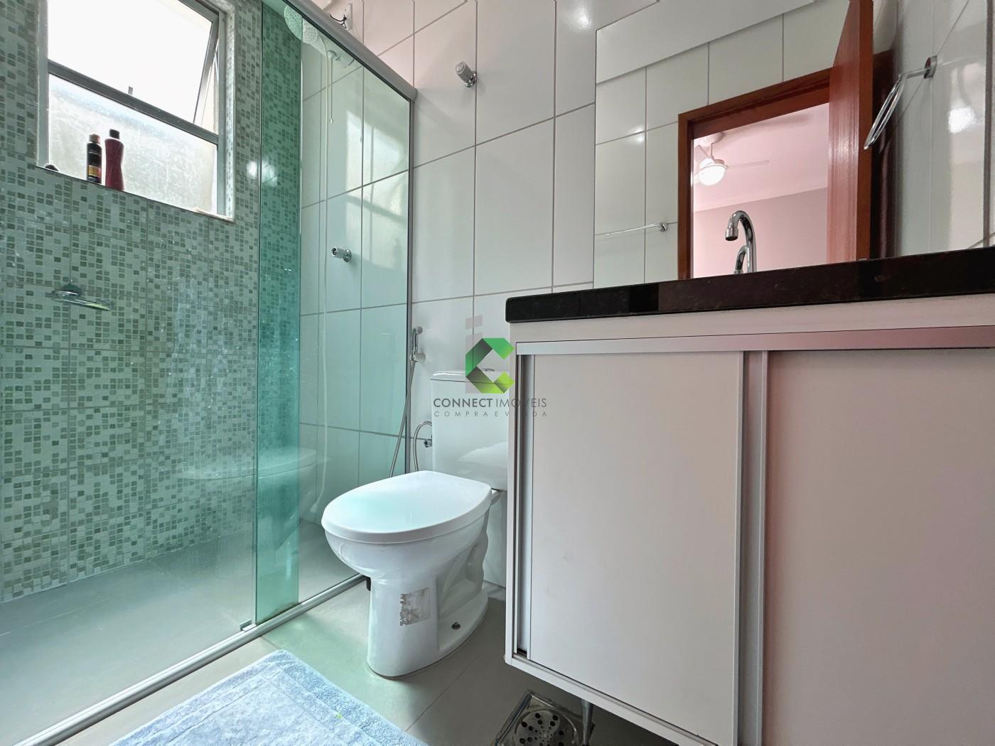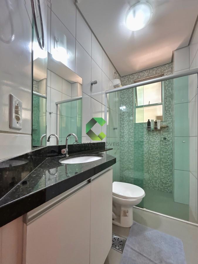 A cozinha é planejada, com piso em porcelanato, bancada em granito e armários de excelente padrão. O banho social segue o mesmo estilo, com bancada em granito, armário planejado e box em vidro temperado.